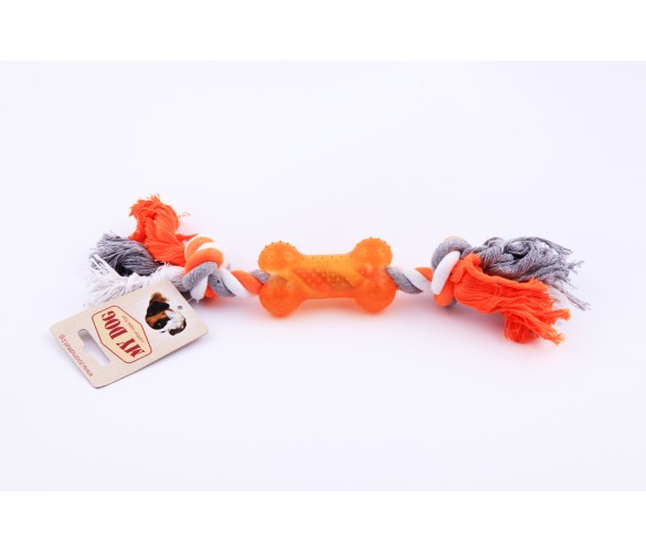 Играчка за куче от памучно въже с гумен кокал. Часове на забавление за кучето, което ще дъвче гумения кокал и ще размята въжето, навсякъде.