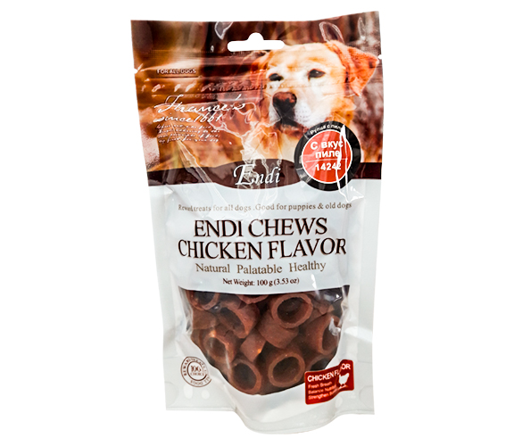 Състав: Царевично нишесте, оризово брашно, пшеничен глутен, глицерин, пиле, растително масло, екстракт от корен цикория, овкусител пиле, оцветители и консерванти.