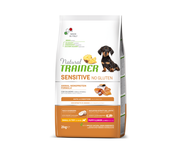 Natural Trainer Sensitive No Gluten Puppy&Junior Small Salmon със сьомга задоволява хранителните нужди на кученца и млади кучета от малките породи. Тя е формулирана със сьомга като единствен източник на животински протеин и не съдържа глутенови компоненти. Тези гранули са идеални за кучета с храносмилателна чувствителност. Суха храна Natural Trainer е приготвена с пълнозърнести храни, пребиотици и 100% натурален екстракт от ананас, които подпомагат храносмилателната функция. Също така съдържа нуклеотиди, извлечени от дрожди, които поддържат имунната система. Рецептата е без добавени захари, оцветители и консерванти. Подходяща е като пълноценна ежедневна храна за млади кучета от 2 месечна възраст.