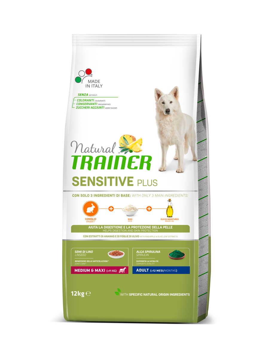 Natural Trainer Sensitive Plus Adult Medium-Maxi със заешко, ориз и царевично олио е пълноценна и балансирана суха храна за кучета от средни и големи породи. Рецептата без глутен.