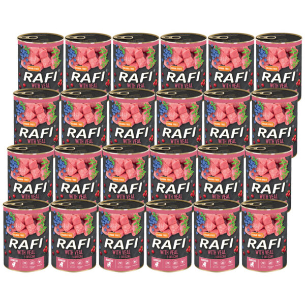 Мократа храна Rafi Junior с телешко е лесноусвоим продукт с високо съдържание на пълноценни и лесноусвоими протеини, необходими за правилния растеж и развитие на малките кученца. Телешкото месо и суровини са ценен източник на лизин, триптофан и левцин. Те съдържат мед, цинк и витамини, покриващи дневната нужда от тези съставки. Благодарение на съдържанието на масло от сьомга, храната осигурява ненаситени мастни киселини от семействата Омега-3 и Омега-6, които поддържат естествения имунитет и подобряват функционирането на храносмилателната система. Синята и червената боровинка осигуряват много хранителни вещества и витамини, а заедно с мащерката повишават сетивната привлекателност на храната.