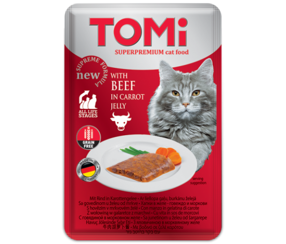 Пълноценна храна за котки Tomi – вкусен пауч с хапки говеждо месо в морковено желе. Без зърнени култури. Без добавени консерванти и оцветители.