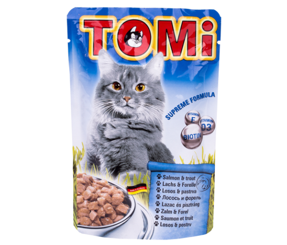 Пълноценна храна за котки Tomi – вкусен пауч със сьомга и пъстърва. Без добавени консерванти и оцветители.